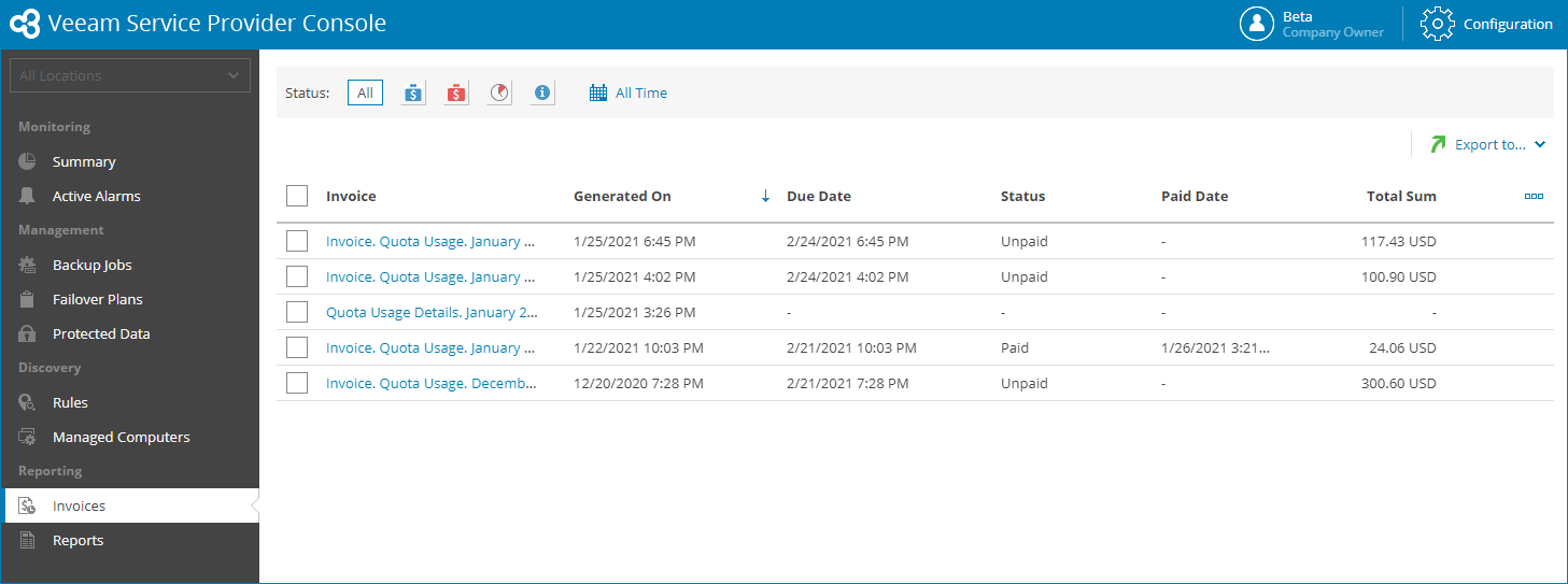 Veeam Service Provider Console will display a list of invoices. To narrow down the list of invoices, you can use the following filters: