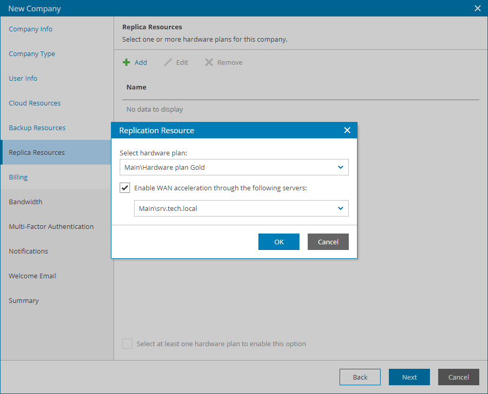 At the Replica Resources step of the wizard, you can allocate replication resources to the company: