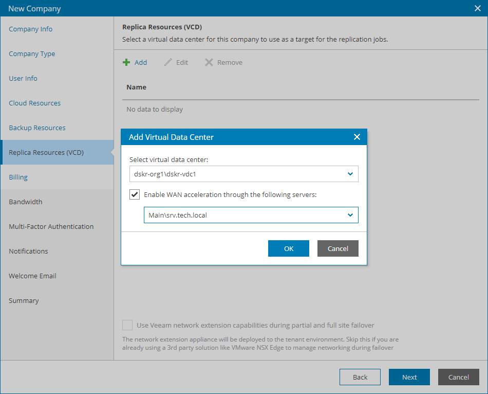 The source WAN accelerator must be configured on the company side. The company must select the source WAN accelerator when configuring a replication job.