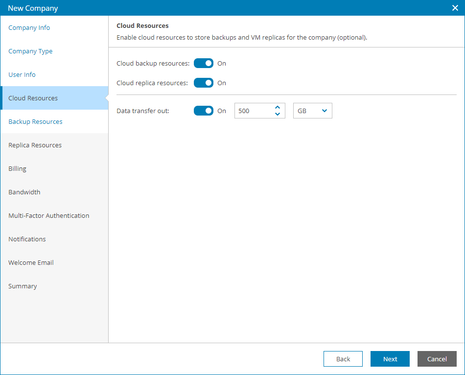 - To allow a company to use cloud backup resources, set the Cloud backup resources toggle to On.