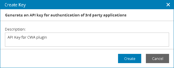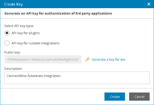To configure Veeam Service Provider Console integration with third party solutions or Veeam Service Provider Console plugins, for example ConnectWise Automate, you must generate API keys. Veeam Service Provider Console uses API keys to authenticate requests from third party solutions to Veeam Service Provider Console server.
