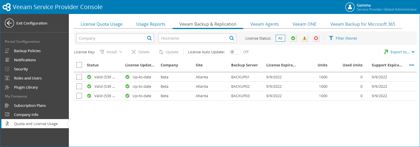 The Veeam Backup & Replication view provides a list of Veeam Backup & Replication servers managed in Veeam Service Provider Console, and information about their license status.