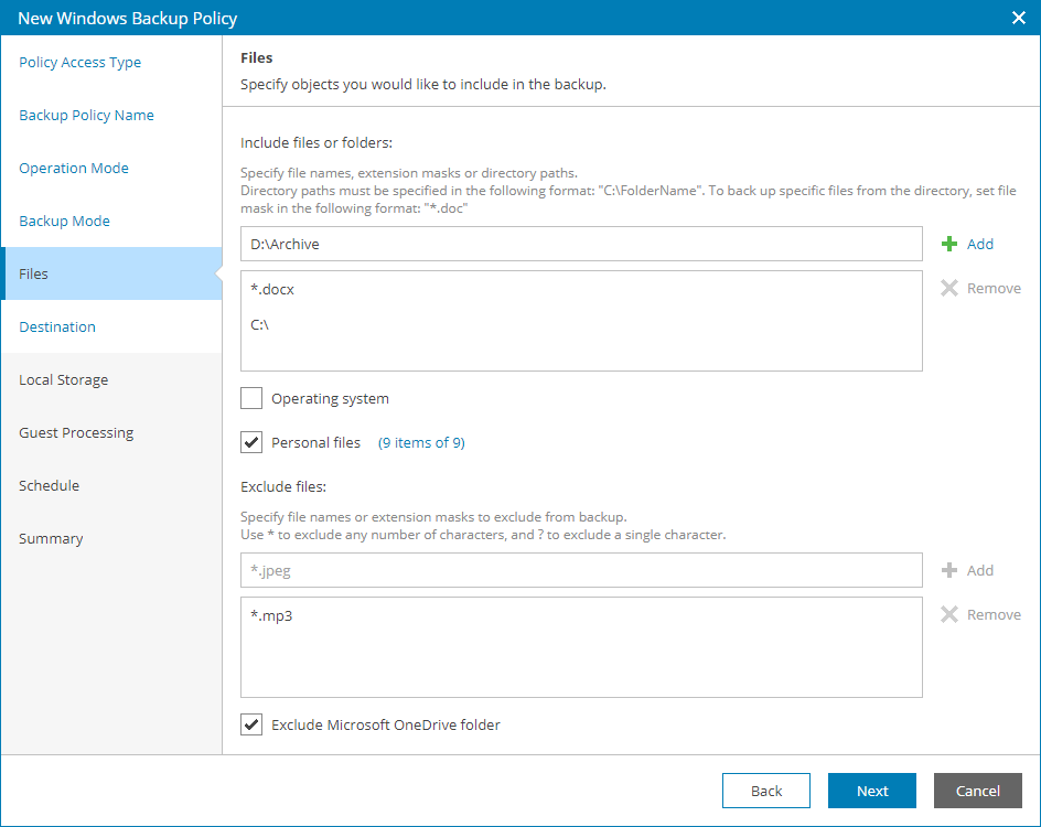 You can specify file names and/or masks for file types that you do not want to back up, for example, OldPhotos.rar, *.tmp, *.back. Veeam backup agent will back up all files except files of the specified type.