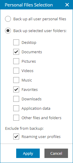 - To exclude from the backup roaming user profile data, select the Roaming user profiles check box.