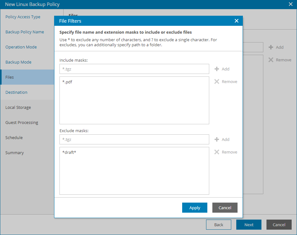 - In the Include masks field, specify file name and/or mask for file types that you want to back up, for example, Report.pdf or *filename*. Veeam backup agent will create a backup only for selected files. Other files will not be backed up.