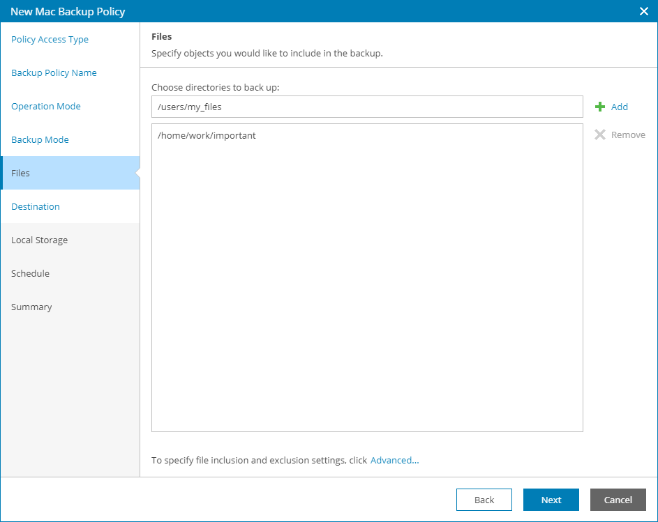 The Files step of the wizard is available if at the Backup Mode step you have chosen to create a backup of individual folders.