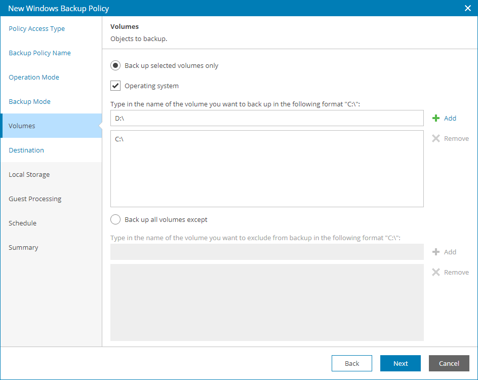 - Select the Back up all volumes except option to specify volumes that you want to exclude from the backup scope: