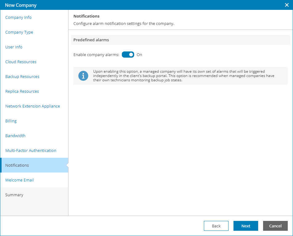 At the Notifications step of the wizard, configure alarm notification settings for the company. Set the Enable company alarms toggle to On, to enable alarms for the company in the client portal.