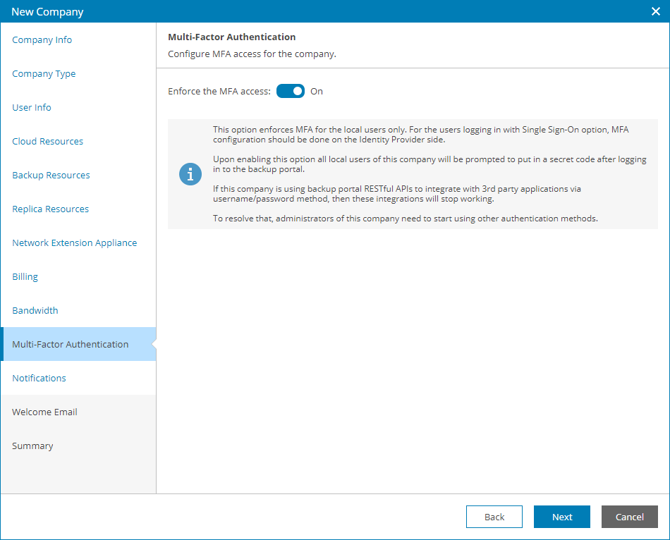 At the Multi-Factor Authentication step of the wizard you can assign a second authentication factor to all company users. For details on MFA, see Configuring Multi-Factor Authentication.