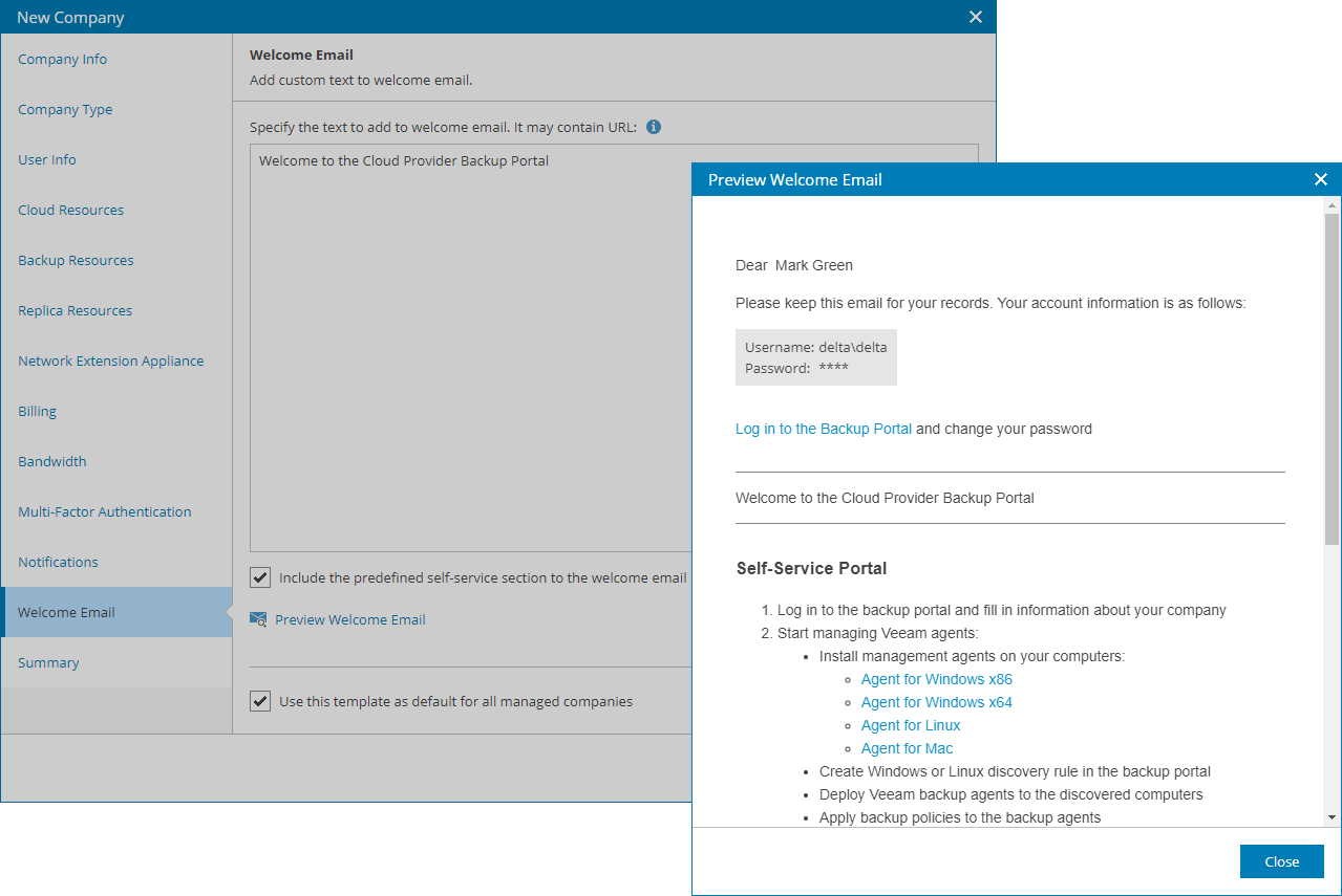 - To save welcome email settings as a template and use it for all managed companies, select the Use this template as default for all managed companies check box.