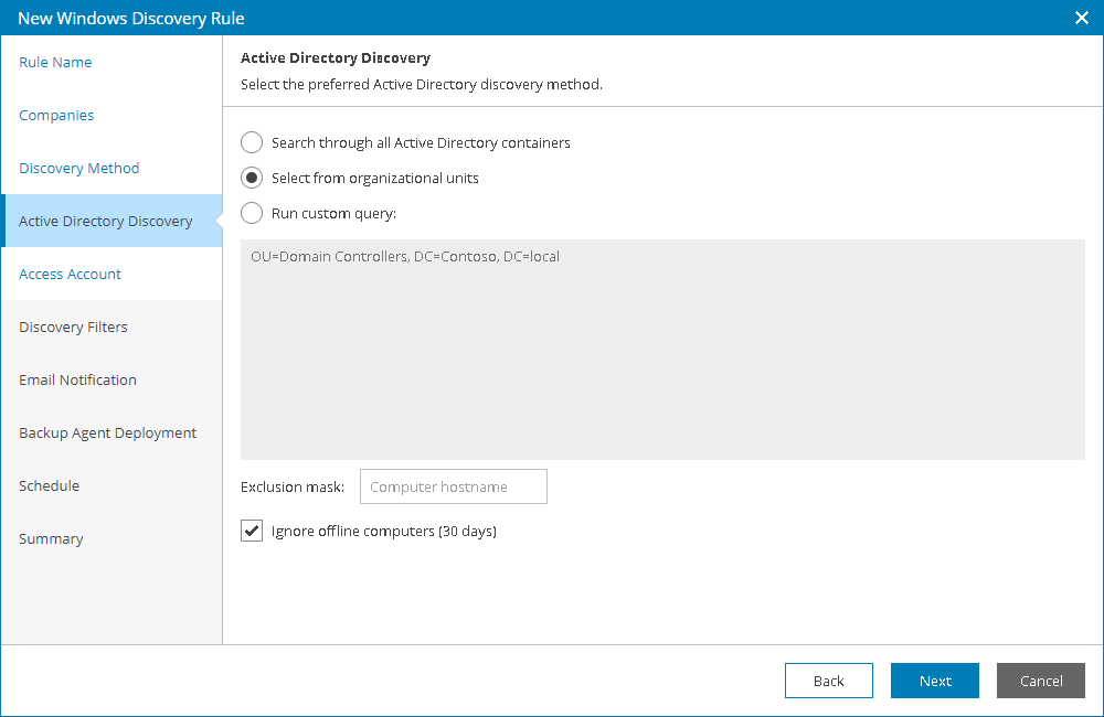 - Select Select from organizational units to discover computers that are included in selected organizational units only.