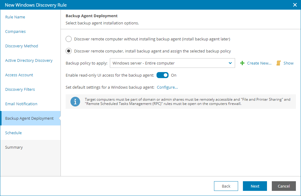 - By default, the read-only access mode is enabled for all Veeam backup agents installed as part of discovery. To disable the read-only access mode for Veeam backup agents on discovered computers, set the Enable read-only UI access for the backup agent toggle to Off.