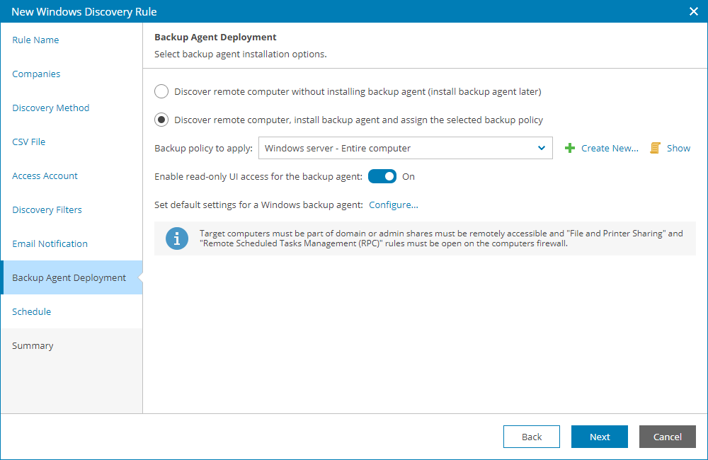 - If after discovery Veeam backup agents must be installed automatically, select the Discover remote computer, install backup agent and assign the selected backup policy option.