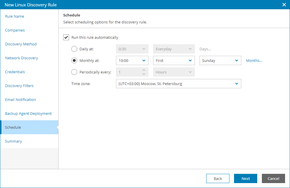 - At the Schedule step of the wizard, specify schedule according to which discovery must be performed: