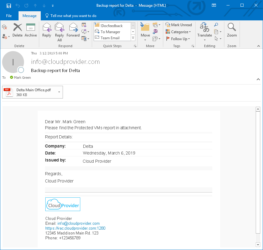 A report notification is an email message with an attached backup report that is sent to a managed company.