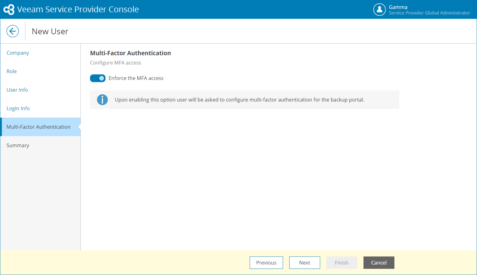 To enable MFA for the new user, set the Enforce the MFA access toggle to On. On the next authorization session, the user will be prompted to configure MFA.