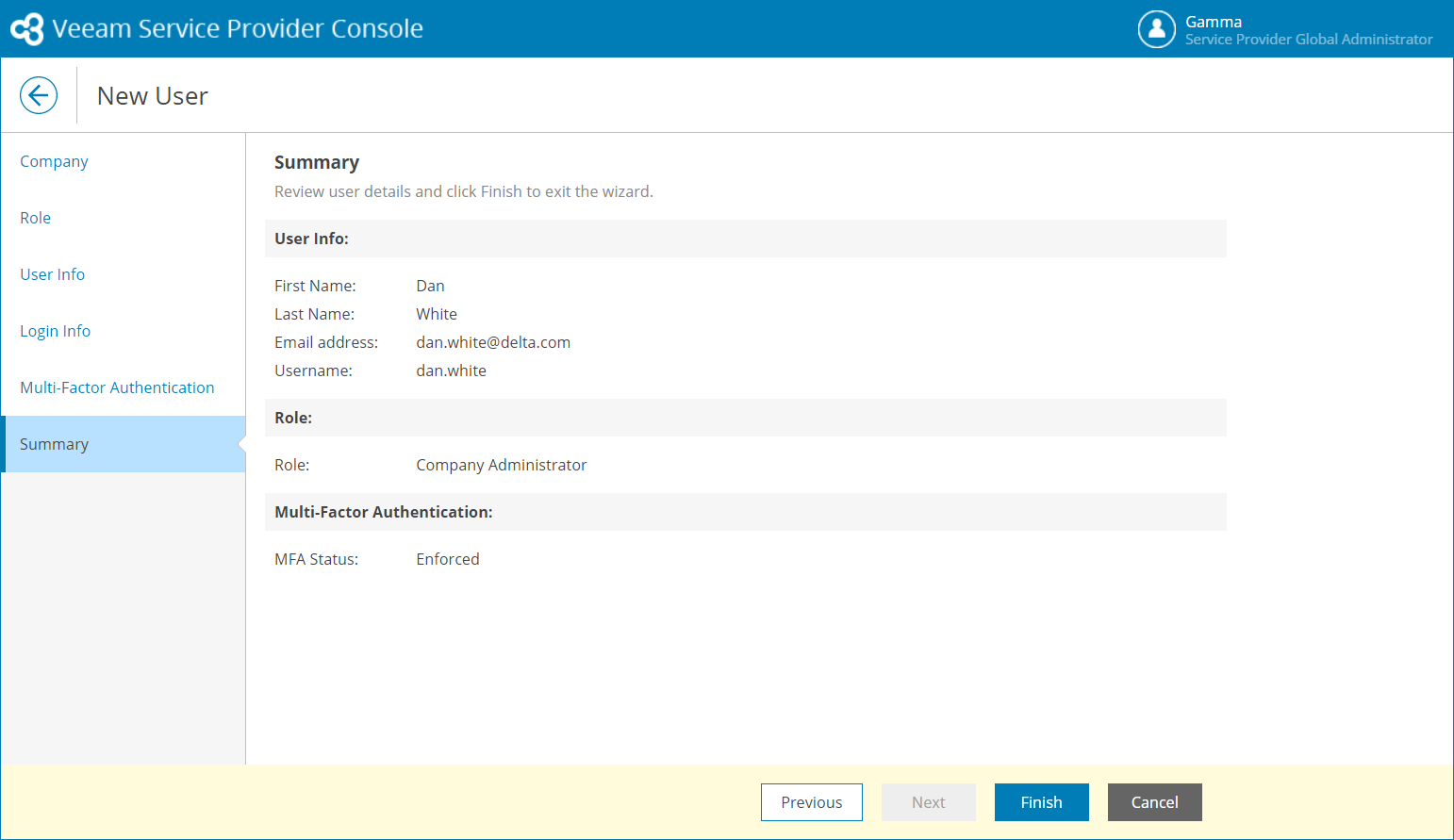 - At the Multi-Factor Authentication step of the wizard you can assign a second authentication factor to the new user. For details on MFA, see Configuring Multi-Factor Authentication.