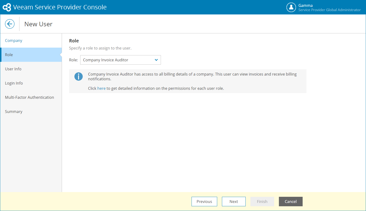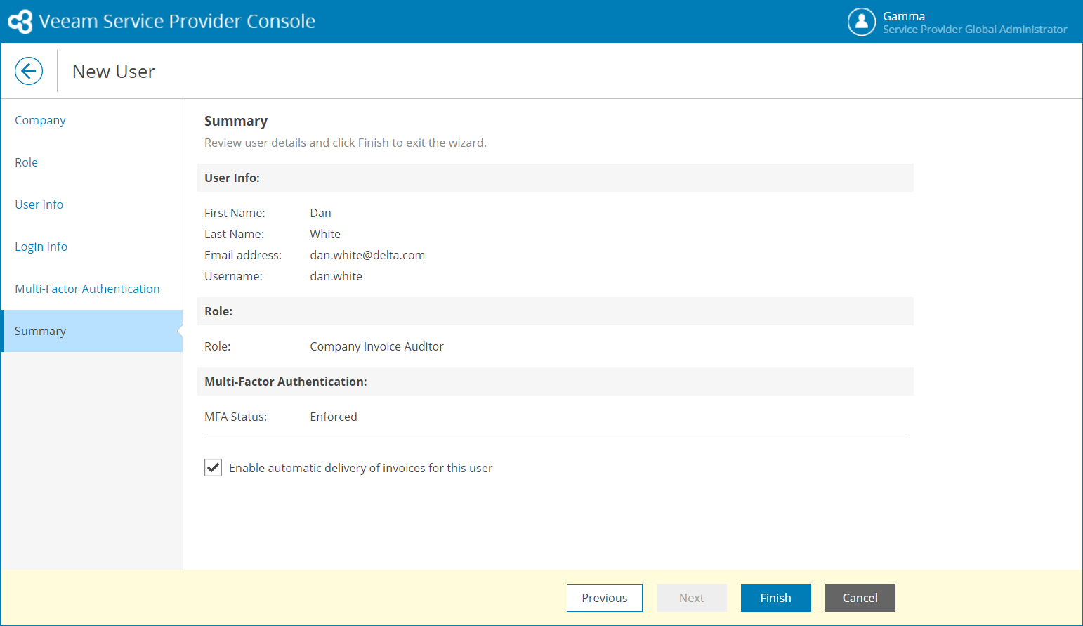 If you want to send to the user all company invoices, select the Enable automatic delivery of invoices for this user check box. Veeam Service Provider Console will send the invoices automatically after generation.