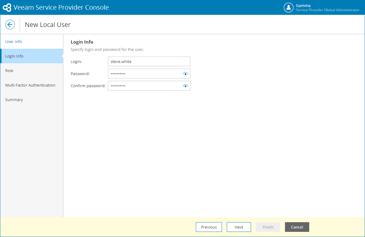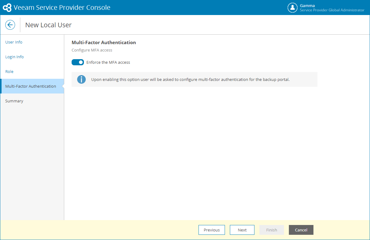 - At the Multi-Factor Authentication step of the wizard you can assign a second authentication factor to the created user. For details on MFA, see Configuring Multi-Factor Authentication.