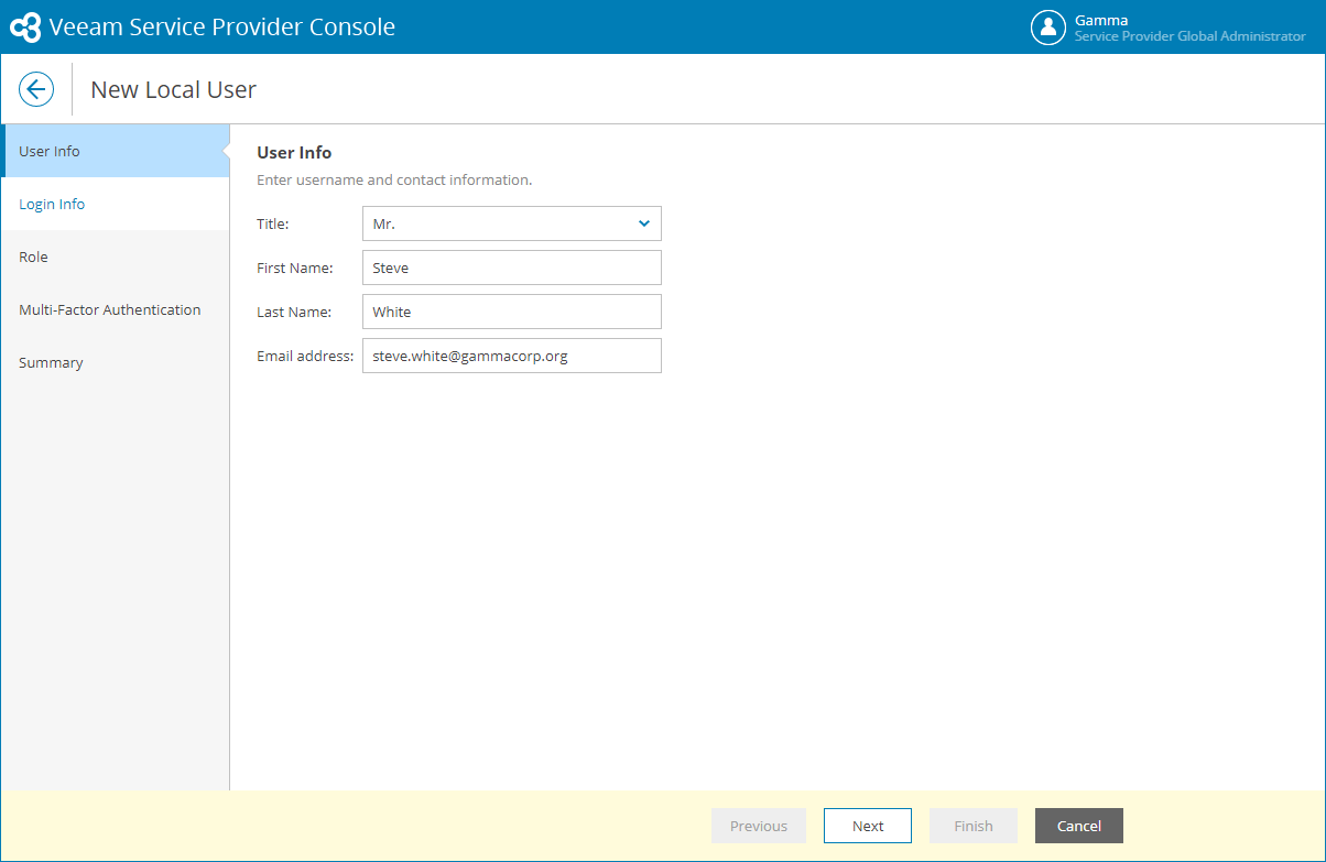 - At the User Info step of the wizard, specify user's title, first name, last name and email address.