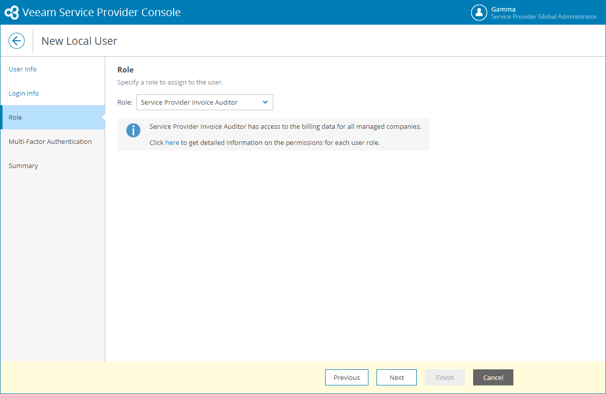 - At the Role step of the wizard, from the Role drop-down list, choose Service Provider Invoice Auditor.