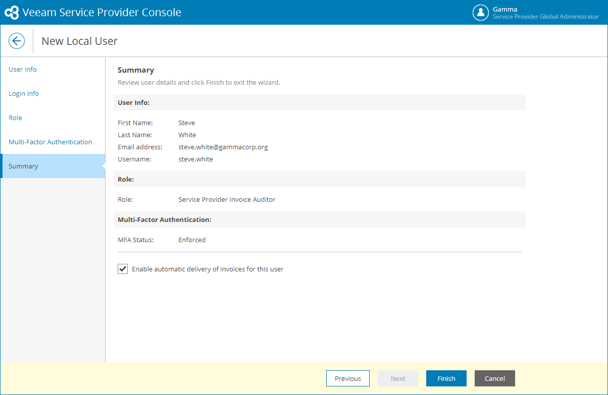 If you want to send to the user all company invoices, select the Enable automatic delivery of invoices for this user check box. Veeam Service Provider Console will send the invoices automatically after generation.