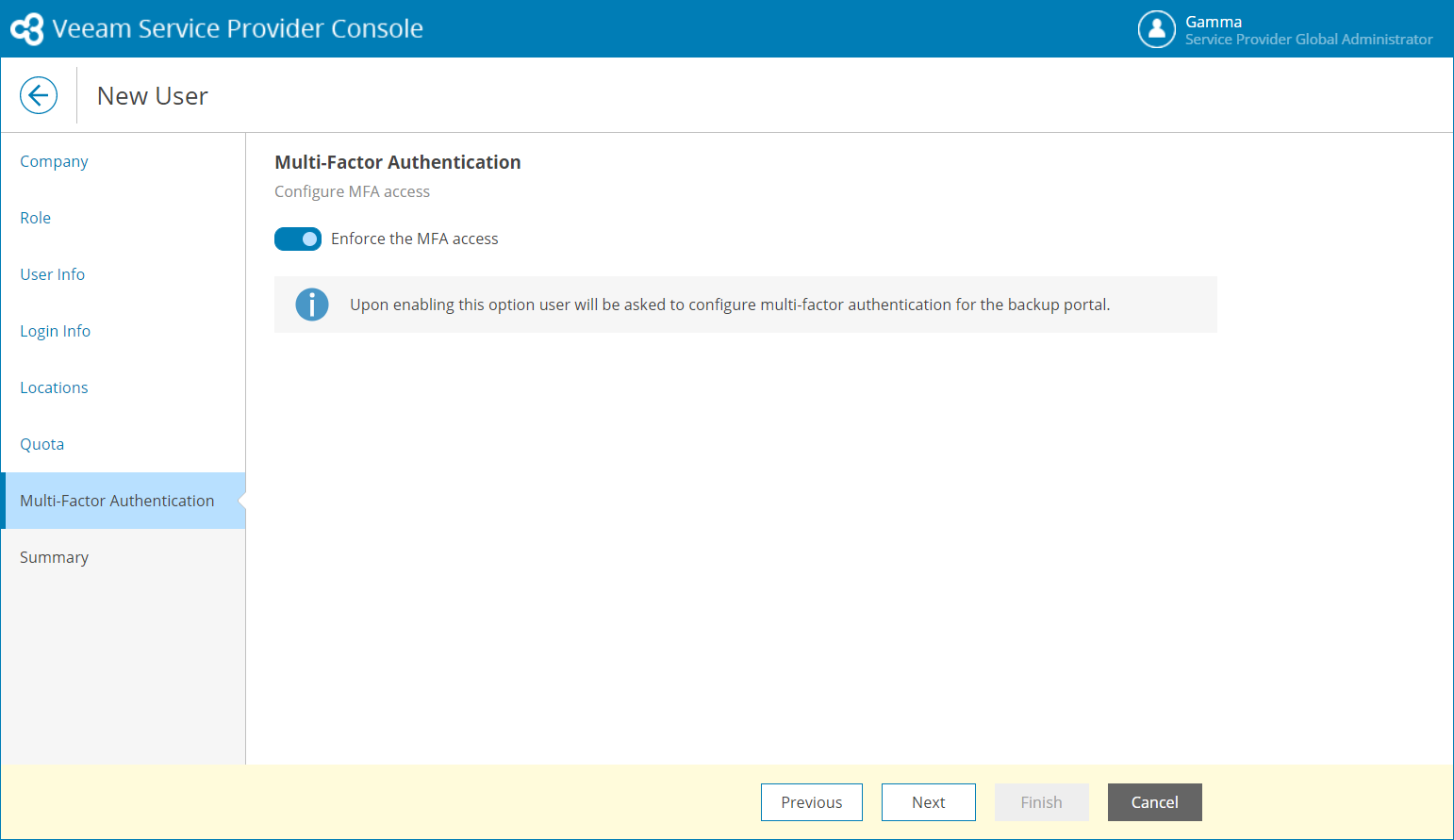 To enable MFA for the new user, set the Enforce the MFA access toggle to On. On the next authorization session, the user will be prompted to configure MFA.