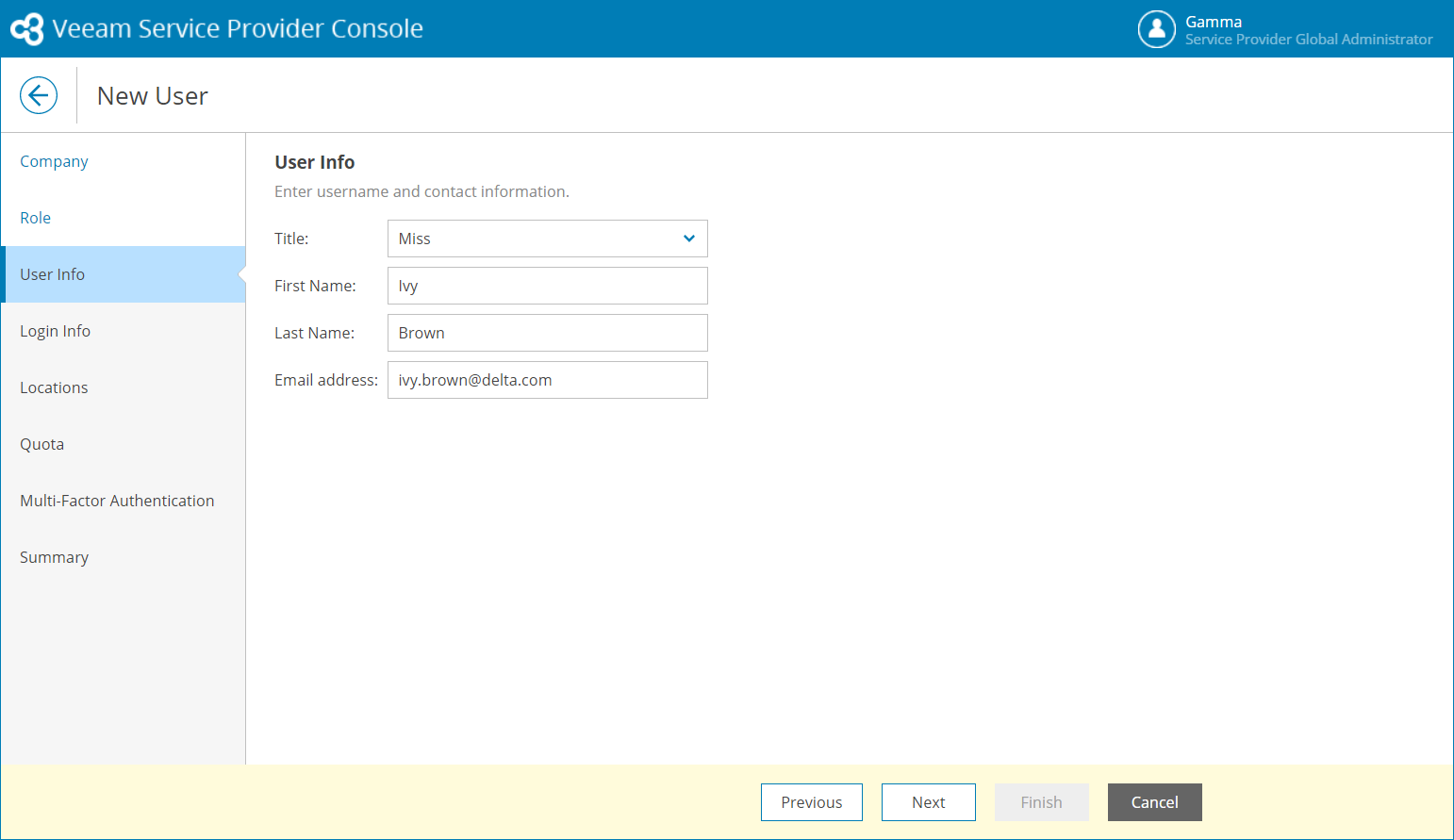 - At the User Info step of the wizard, specify user title, first name, last name and email address.