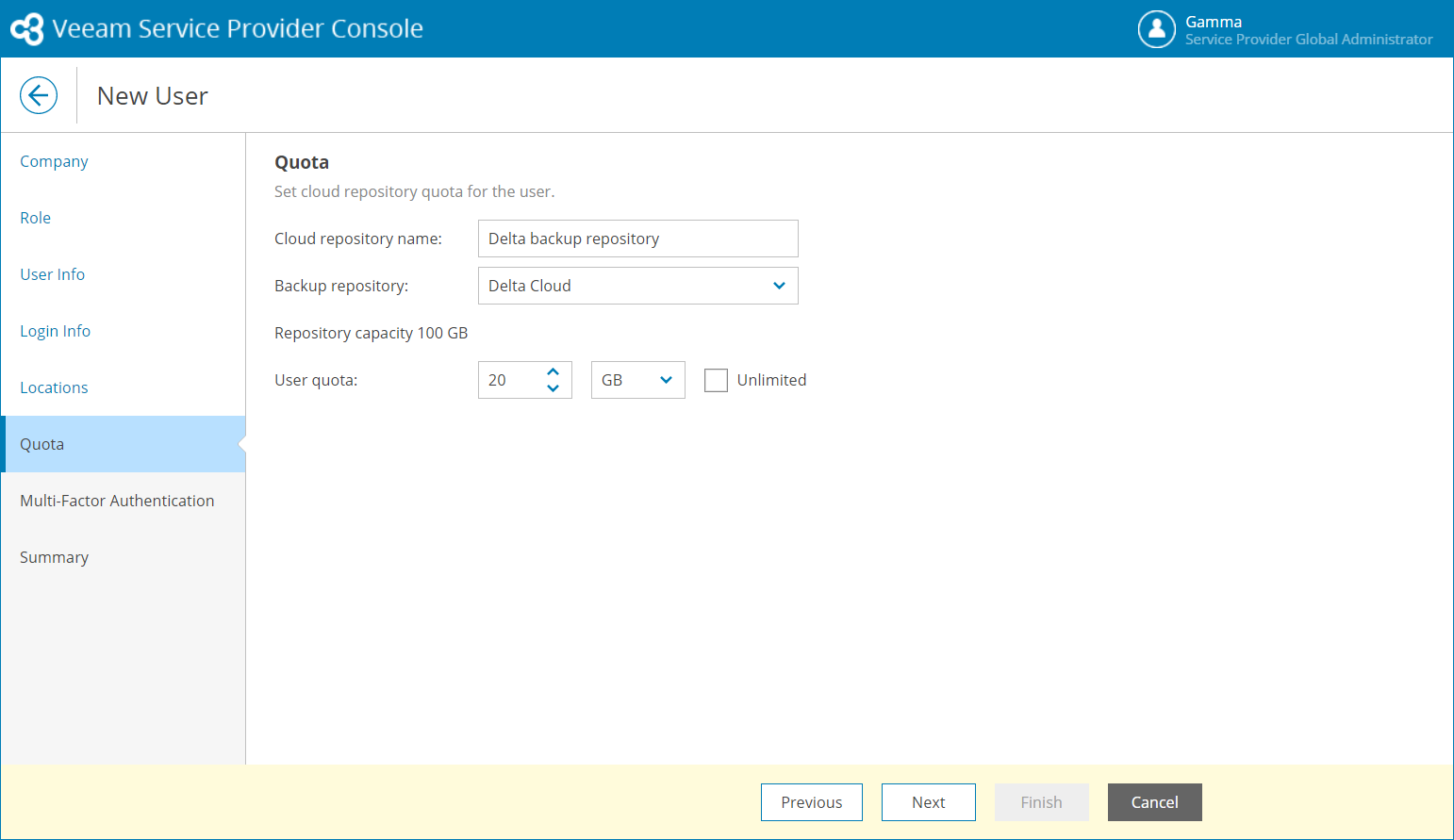- At the Quota step of the wizard, allocate cloud repository resources to the user.