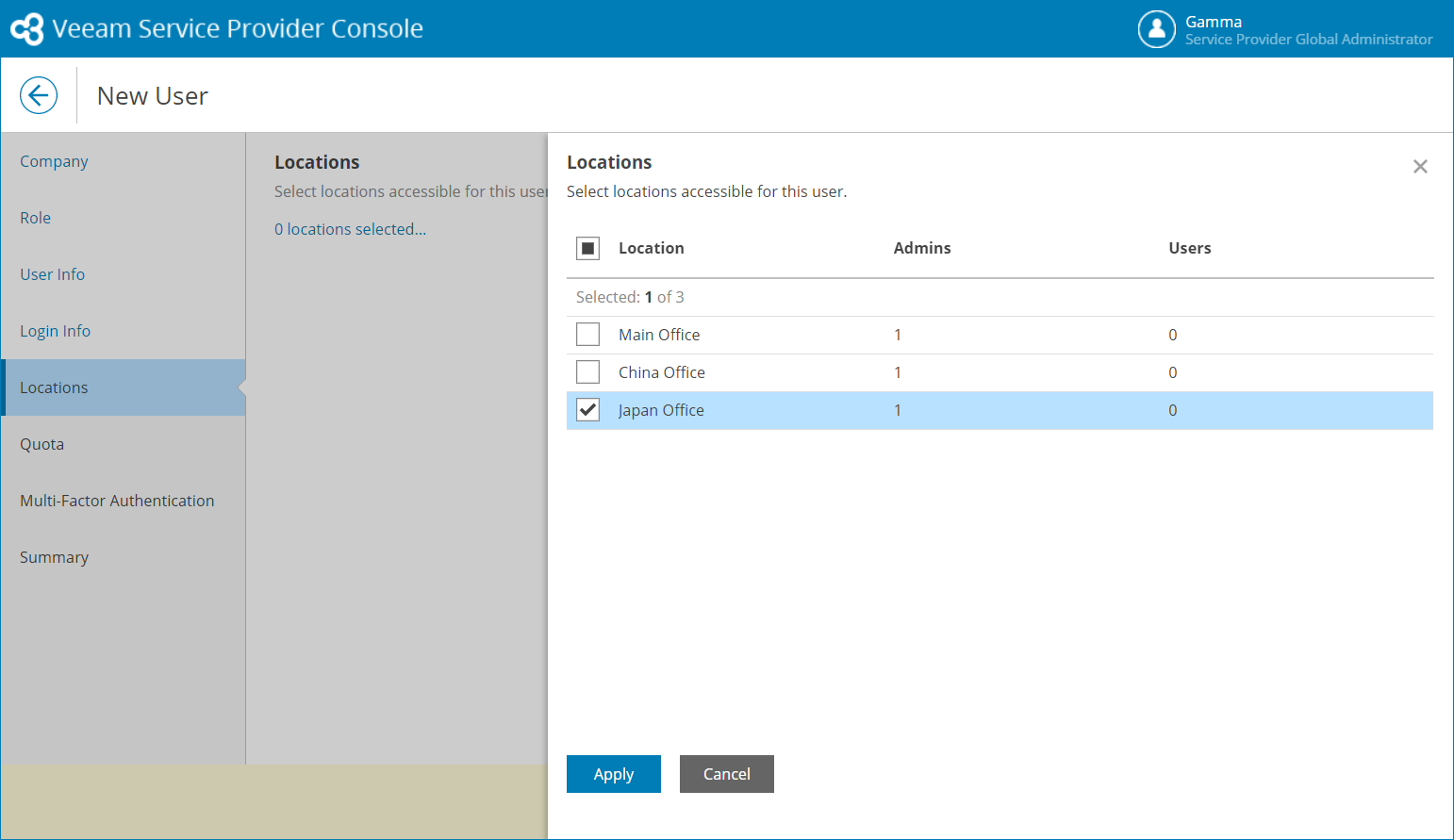 - In the Locations window, select company locations whose data must be available for the user in the Client Portal. Click Apply.