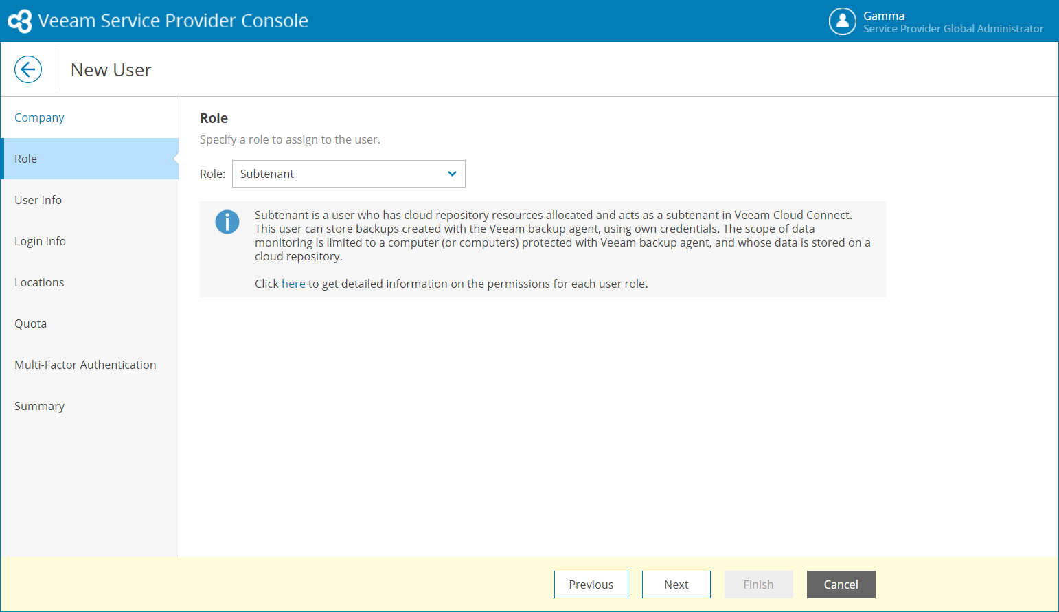 A Subtenant can consume storage resources provided through the user quota for storing Veeam agent backups in the cloud. When pointing a Veeam backup agent job to a cloud repository, you can specify credentials of a Subtenant. Backup files created by the Veeam backup agent job will consume cloud space within the Subtenant quota only.