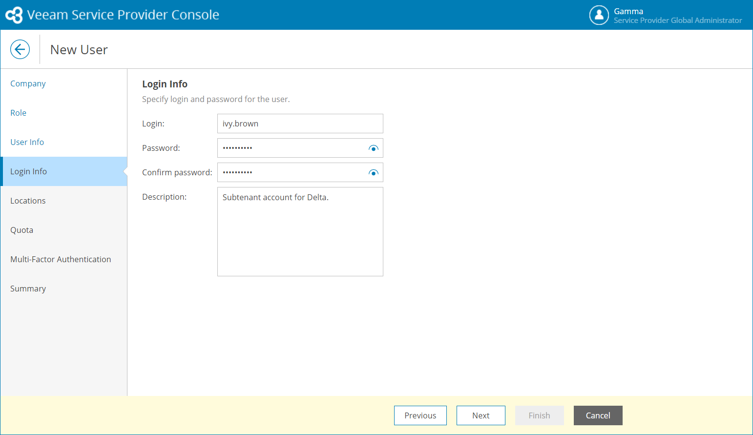 - At the Login Info step of the wizard, in the Login, Password and Confirm password fields, type a user login name and password.