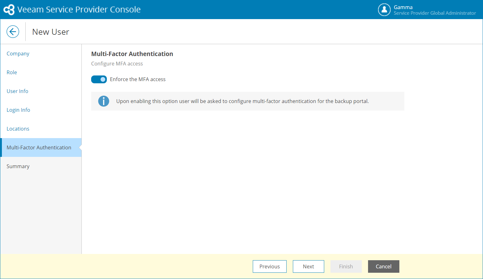 To enable MFA for the new user, set the Enforce the MFA access toggle to On. On the next authorization session, the user will be prompted to configure MFA.