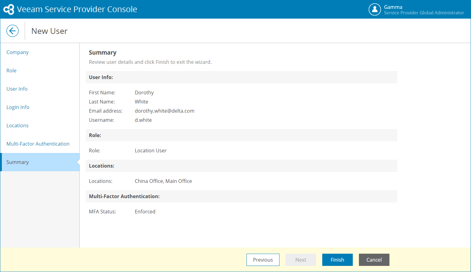- At the Summary step of the wizard, review user details and click Finish.