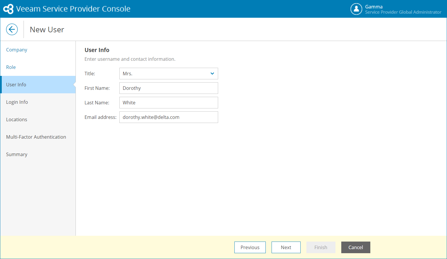 - At the User Info step of the wizard, specify user title, first name, last name, and email address.