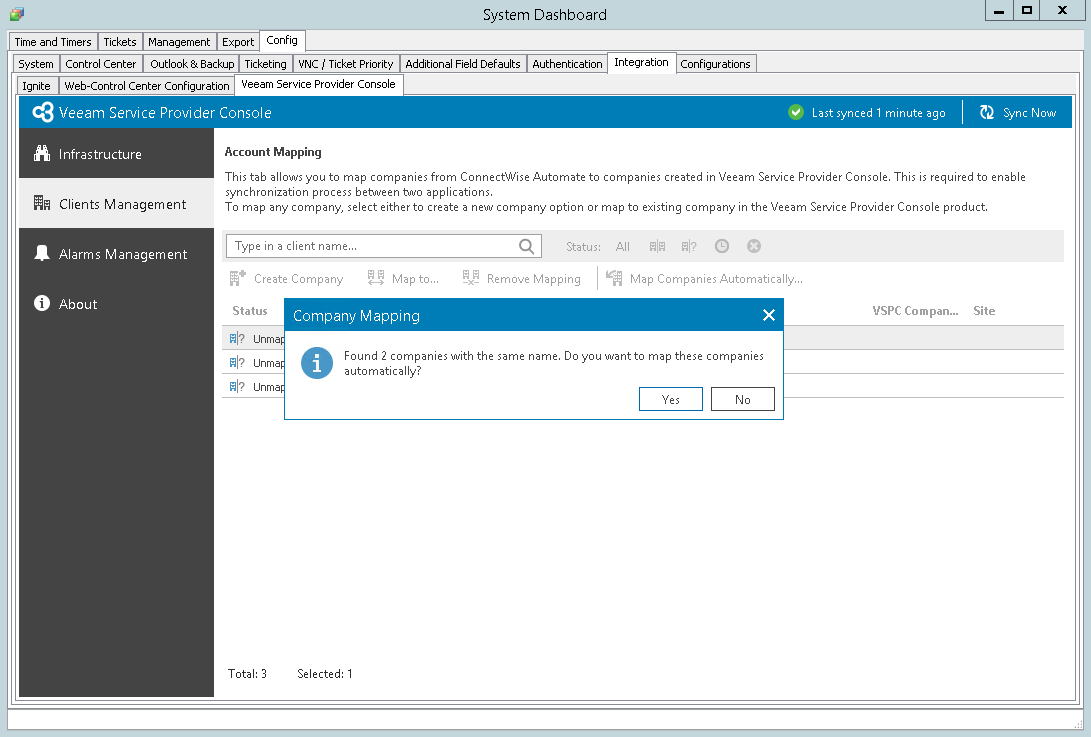 This will automatically detect clients in ConnectWise Automate with the names same or similar to the names of companies configured in Veeam Service Provider Console.