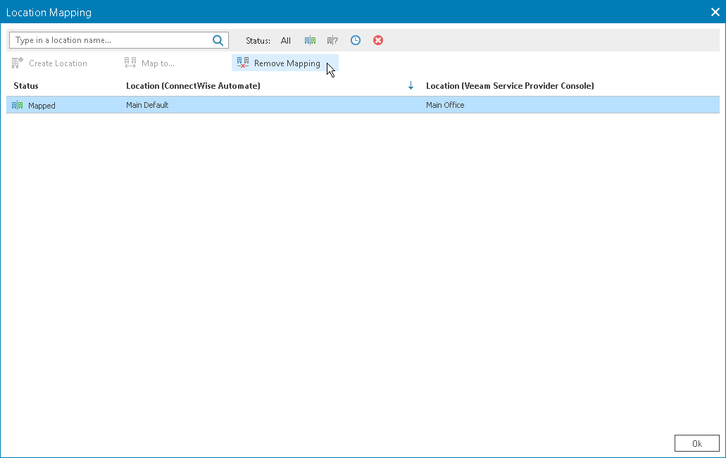 You can remove mapping between Veeam Service Provider Console and ConnectWise Automate locations. After you remove mapping, all new Veeam backup agents installed on ConnectWise Automate managed computers will be assigned to the Default location.
