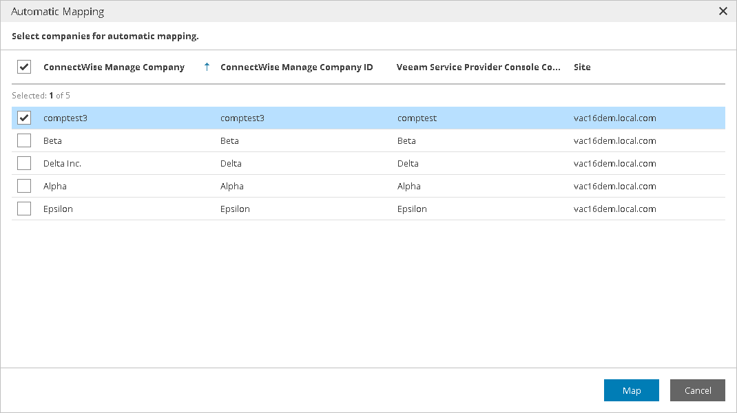 This will automatically detect companies in ConnectWise Manage with the IDs same or similar to the names of companies configured in Veeam Service Provider Console.