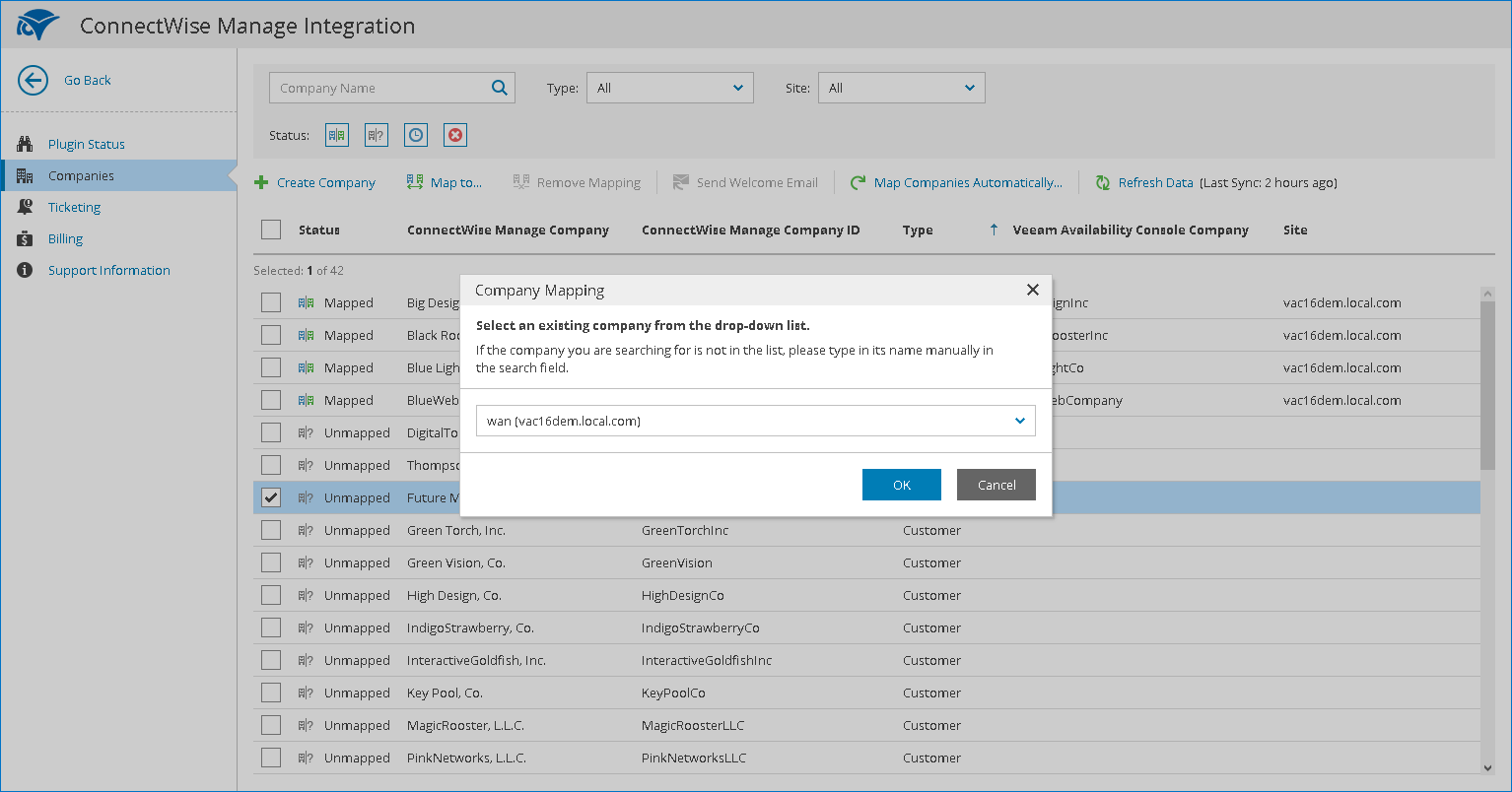 Veeam Service Provider Console will display a list of all companies managed in ConnectWise Manage.