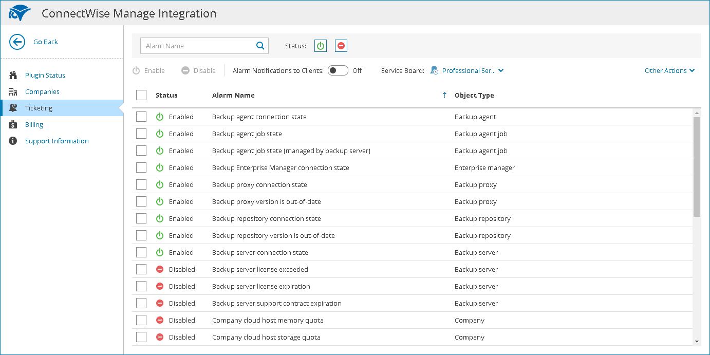 You can configure Veeam Service Provider Console to send information about triggered alarms to ConnectWise Manage and to create service tickets based on alarm data.