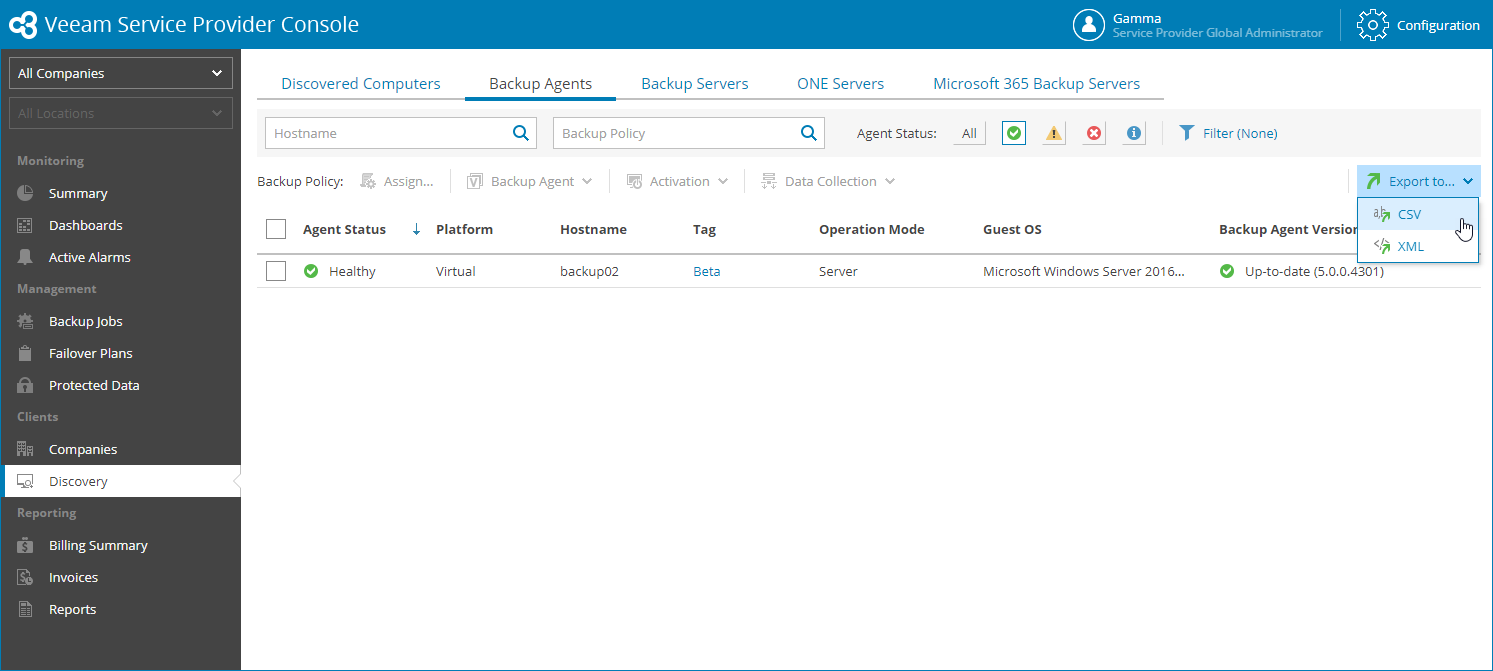 You can view details on managed Veeam backup agents and export them to a CSV or XML file.