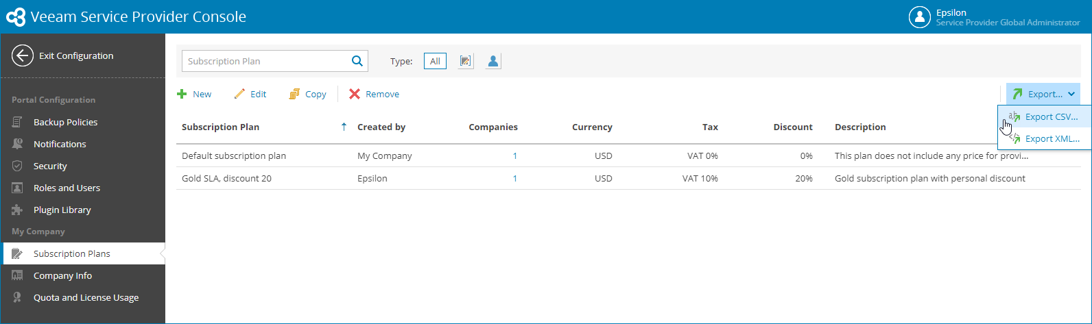 - To export subscription plan details, click Export to and choose a format of the exported data: