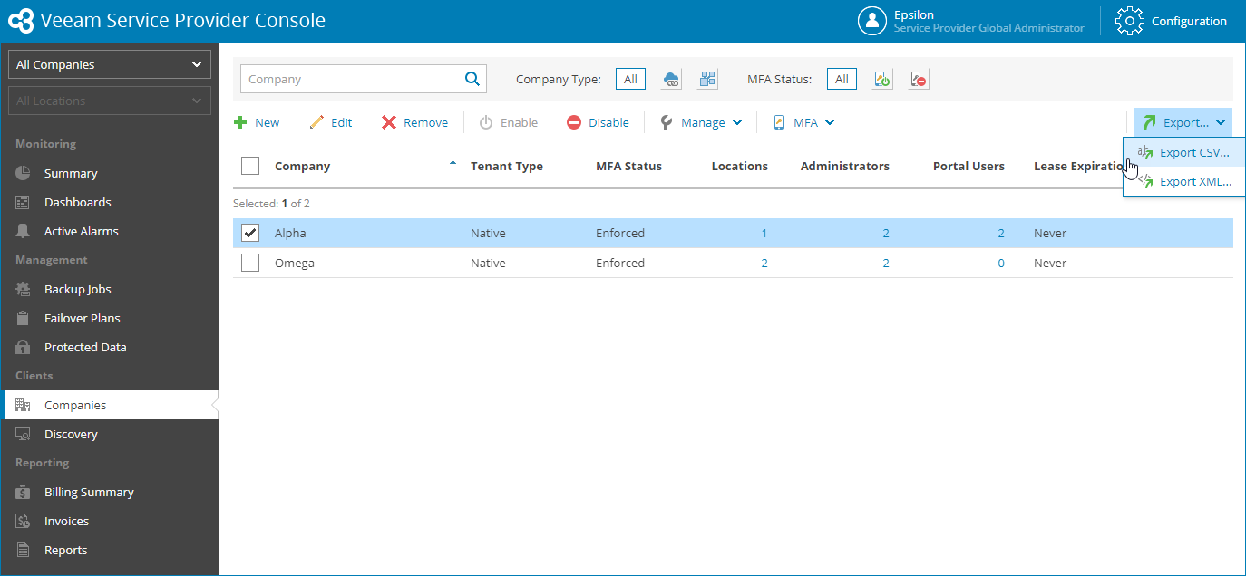 Veeam Service Provider Console will display a list of all registered company accounts.
