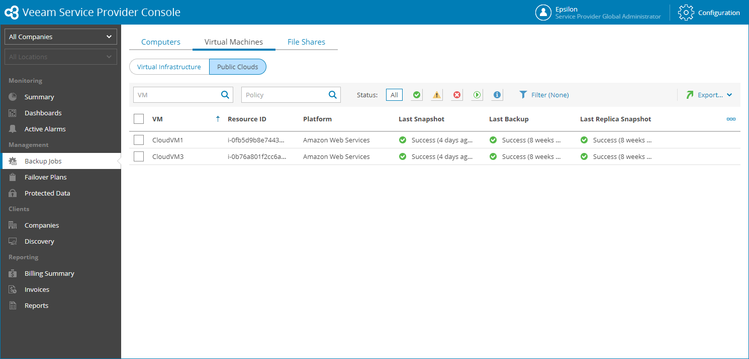 In Veeam Service Provider Console you can view and export job and policy details for the following types of VMs: