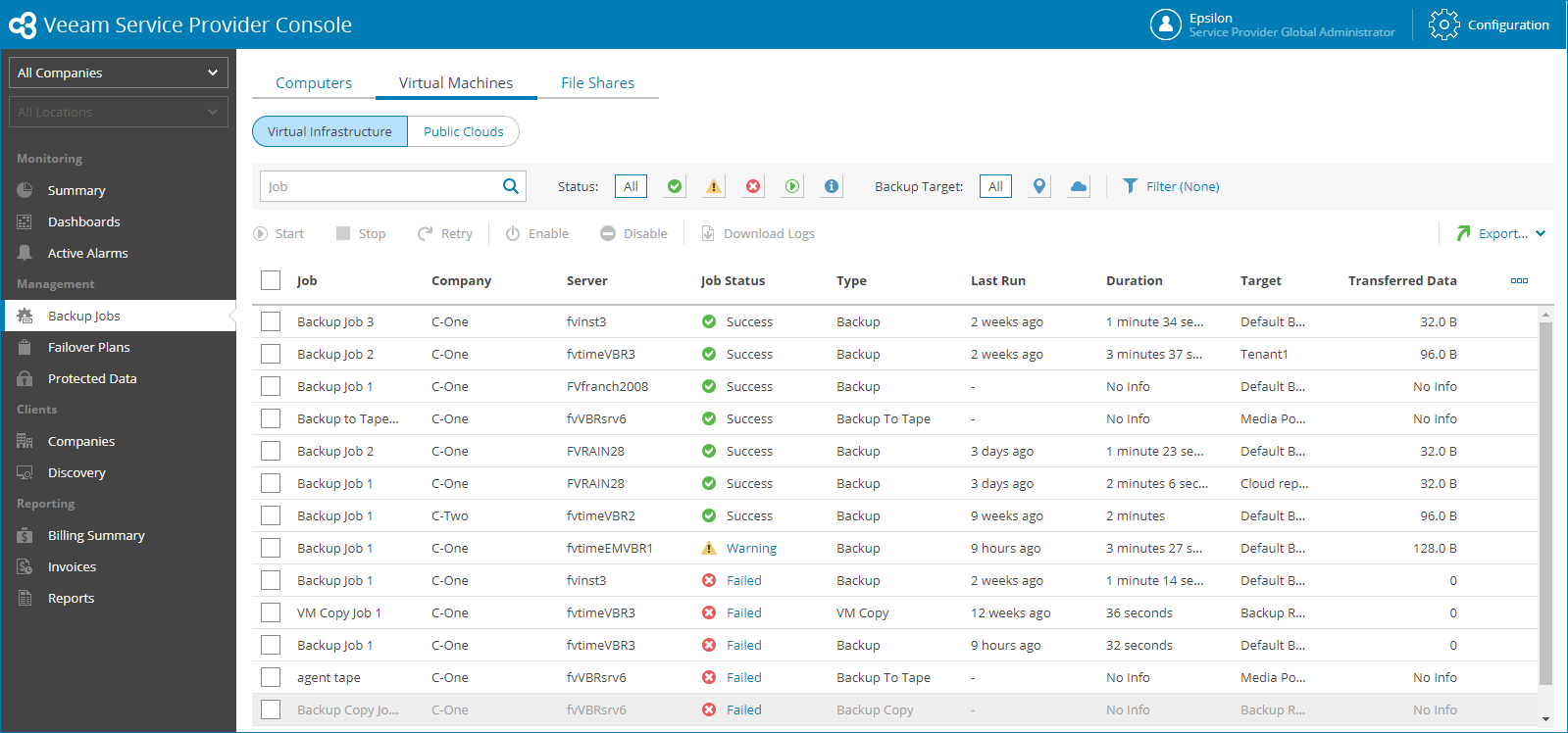 Veeam Service Provider Console will display a list of all VM jobs configured on managed backup servers.