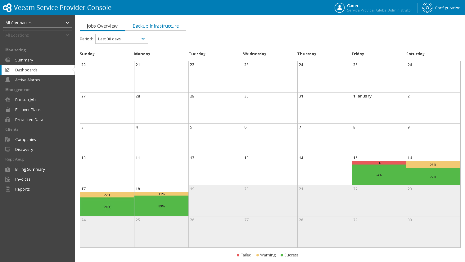 The Jobs Overview dashboard shows ratio of successful jobs and jobs that finished with warnings and errors on each day of a specific period.