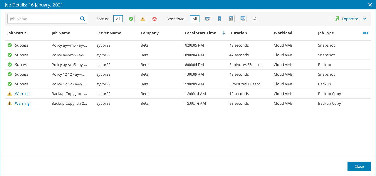 - Workload — type of the workload protected by the job (Virtual Machines, Computers, File Shares, Cloud VMs, Database Transaction Logs).