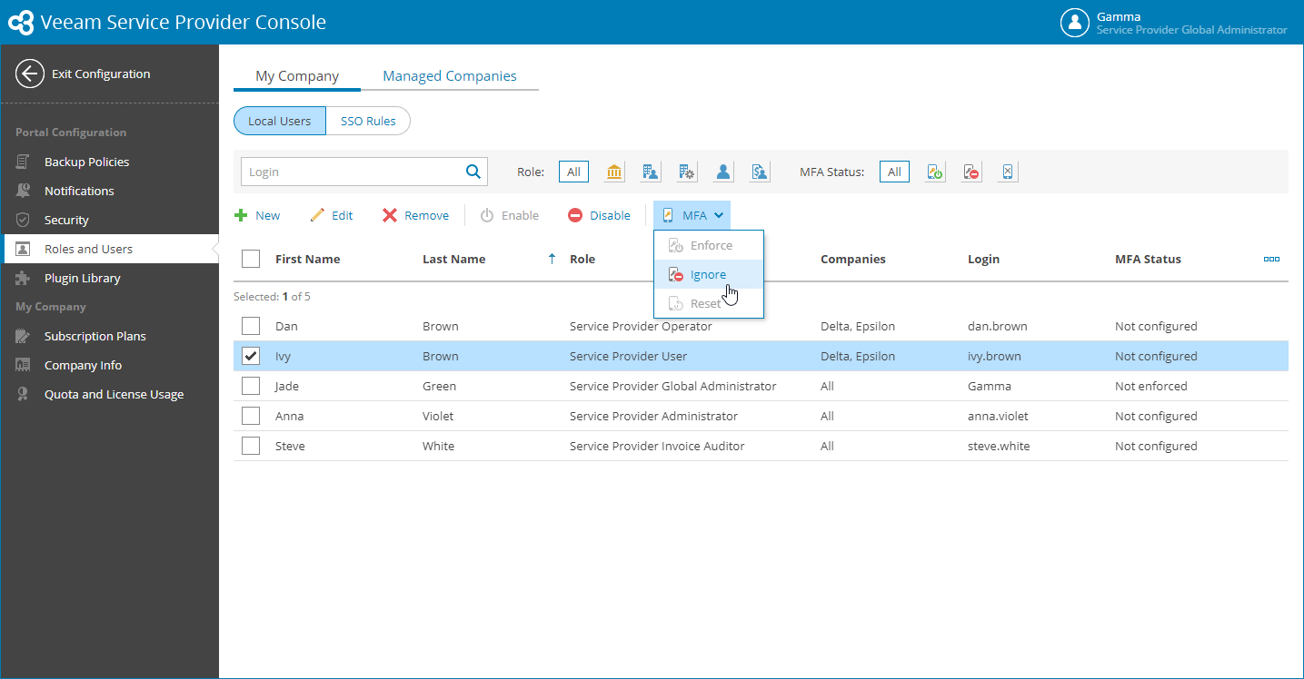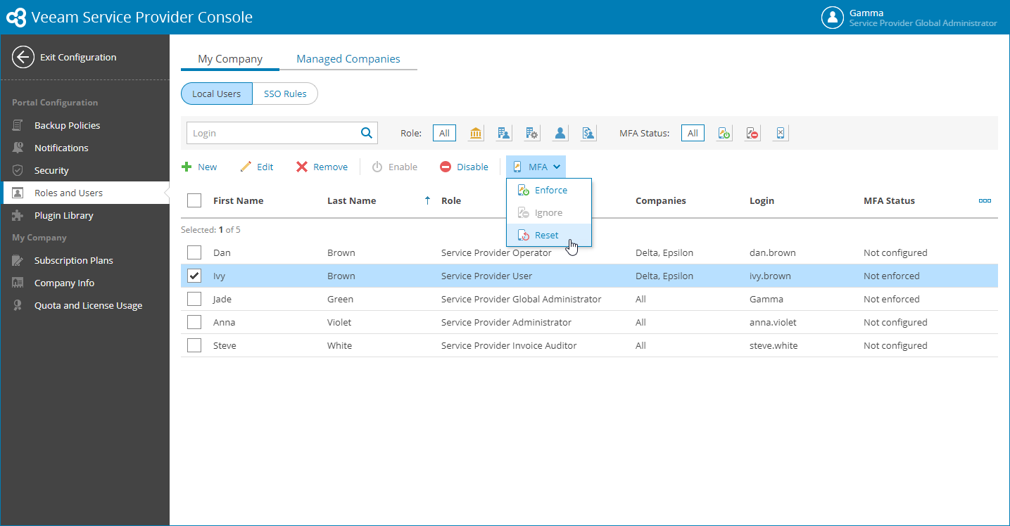 Service Provider Administrator can reset MFA for Service Provider Global Administrator. It can be useful in case Service Provider Global Administrator changes the device that is used for authentication. |