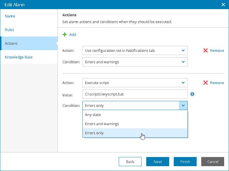 - If an alarm targets the Location object, the script file can reside on managed Veeam backup agents or Veeam backup servers. When the alarm is triggered for a specific location or when the alarm status changes, the script will run on all managed Veeam backup agents and Veeam backup servers that belong to the affected location, provided that the script file is present on these machines. Note that the path to the script on all managed machines must be the same.