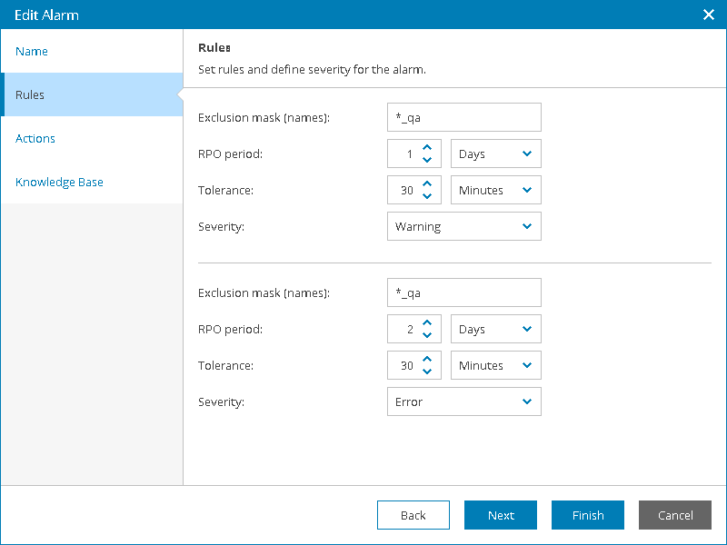 At the Rules step of the wizard, specify conditions according to which the alarm must be triggered. Options available for alarm rules vary for different alarms. Depending on the alarm type, you may need to modify alarm thresholds, alarm tolerance, alarm severity and so on.